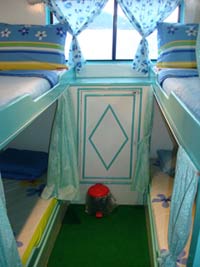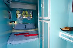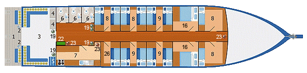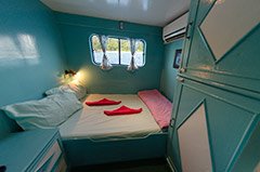 The main deck has 6 cabins for our guests. 2 Double bed, 1 Twin Bunk bed, and three (4) Berth cabins these cabins are fitted with curtains for each bunk bed for your privacy.